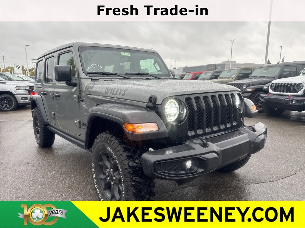 115V Auxiliary Power Outlet, 4-Wheel Drive Swing Gate Decal, 7.0" Touchscreen Display, 8.4" Radio & Premium Audio Group, 8.4" Radio & Premium Audio Group (DISC), Air Conditioning w/Auto Temperature Control, Air Filtering, Alpine Premium Audio System, Anti-Spin Differential Rear Axle, Apple CarPlay, Auto-Dimming Rear-View Mirror, Automatic Headlamps, Black Grille, Black Trail Rated Badge, Cluster 7.0" TFT Color Display, Cold Weather Group, Console Bin Task Light, Convenience Group, Deep Tint Sunscreen Windows, Emergency/Assistance Call, For More Info, Call 800-643-2112, Front 1-Touch Down Power Windows, Front LED Fog Lamps, Google Android Auto, GPS Antenna Input, Heated Front Seats, Heated Steering Wheel, Integrated Center Stack Radio, Leather Wrapped Steering Wheel, LED Headlamp & Fog Lamp Group, LED Premium Reflector Headlamps, Matte Black Jeep Badge, Media Hub-2 USBS (Both Charge Only), Mold In Color Bumper w/Gloss Black, MOPAR All-Weather Floor Mats, Power Heated Mirrors, Power Top Quarter Window Storage Bag, Quick Order Package 22W Willys, Radio: Uconnect 4 w/7" Display, Rear Window Defroster, Rear Window Wiper/Washer, Remote Keyless Entry, Remote USB Port - Charge Only, Removable Rear Quarter Windows, Security Alarm, SiriusXM Radio Service, SiriusXM Satellite Radio, Sky 1-Touch Power Top, Speed Sensitive Power Locks, Sun and Sound Package, Sun Visors w/Illuminated Vanity Mirrors, Technology Group, Universal Garage Door Opener, USB Host Flip, Wheels: 17" x 7.5" Moab Black Aluminum, Willys, Willys Hood Decal, Wrangler Decal.